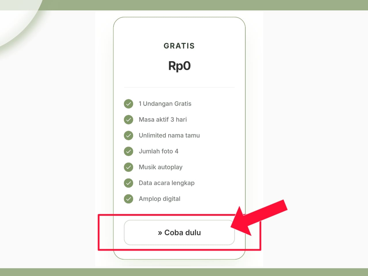 - Masa Aktif 3 Hari: Cocok untuk kamu yang ingin mencoba preview hasil undangan sebelum memutuskan upgrade.