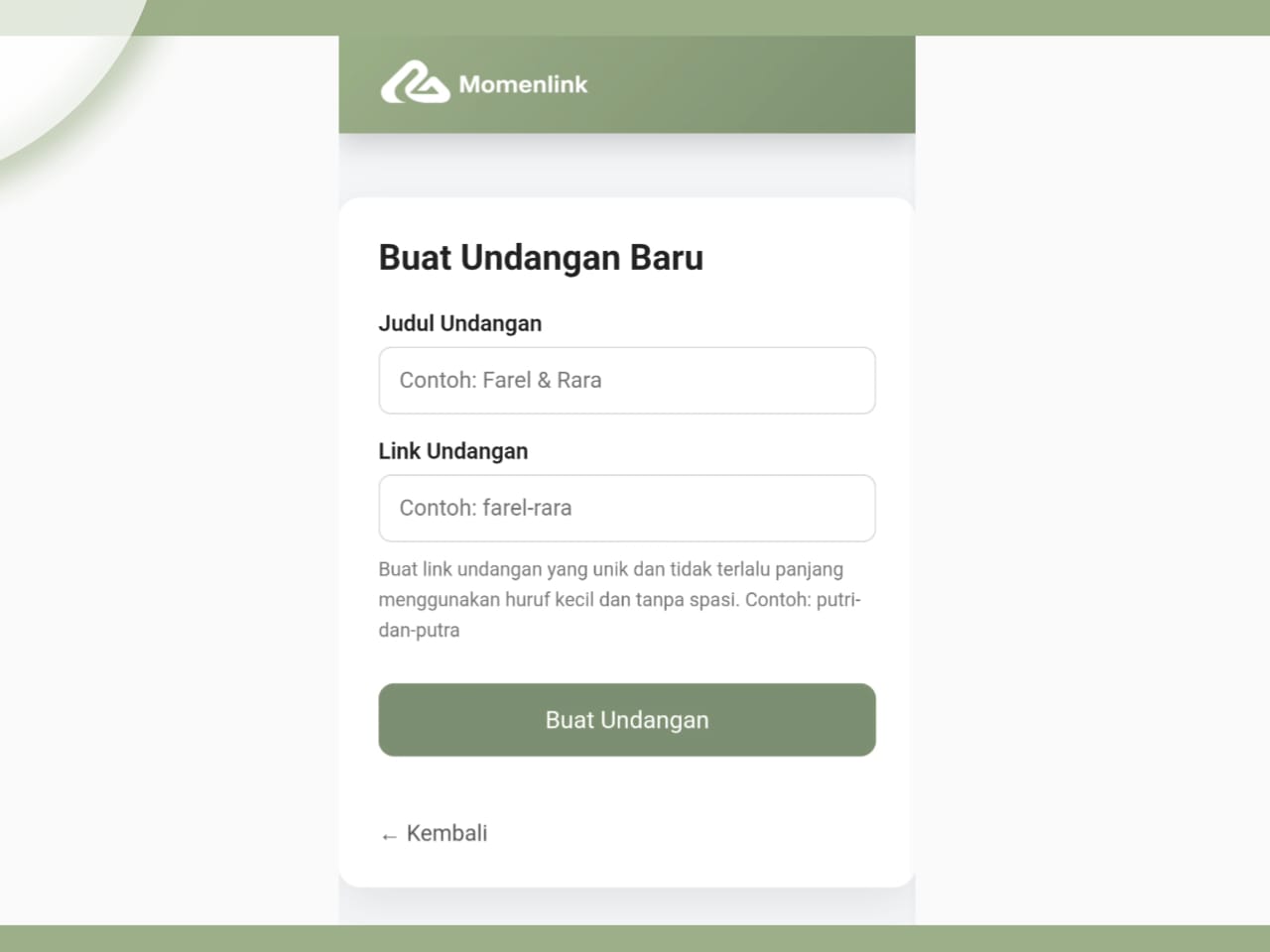 Contoh: Jika namamu Farel dan Rara, kamu bisa mengetik farel-rara. Maka link undanganmu nantinya adalah momenlink.com/farel-rara.