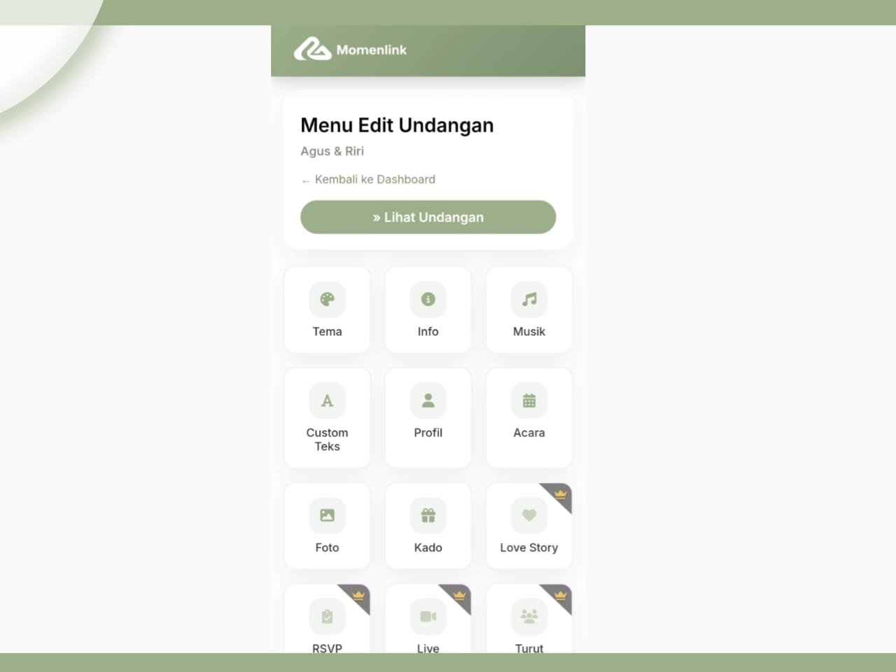 - Buka Semua Fitur Premium: Nikmati fitur RSVP, Love Story, Galeri Video, hingga Buku Tamu Digital yang tidak ada di versi gratis.