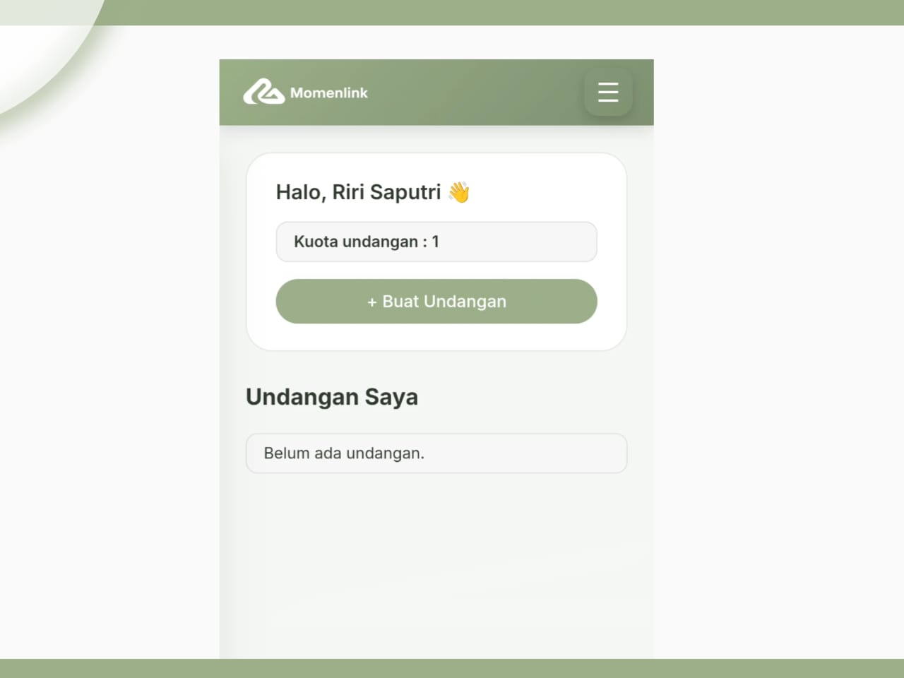 Pada halaman Dashboard utama, kamu akan disambut dengan sapaan hangat dan info kuota undangan kamu.